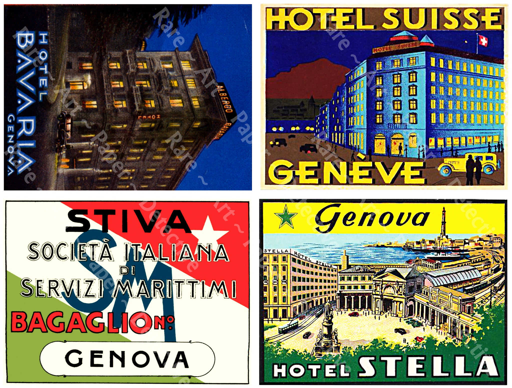 This set of exceptionally colorful hotel luggage labels are right out of the Golden Age of Travel. These travel label reproductions are great for your own travel trunks, up-scaling old suitcases, adding distinguishing marks to your modern luggage bags and all sorts of collage and trip journal accents. The vintage look and style are very eye catching and look particularly stunning on my matte sticker paper. Create a old style travel journal with authentic looking used envelopes using exotic airmail stamps and pages with labels from around the world.
